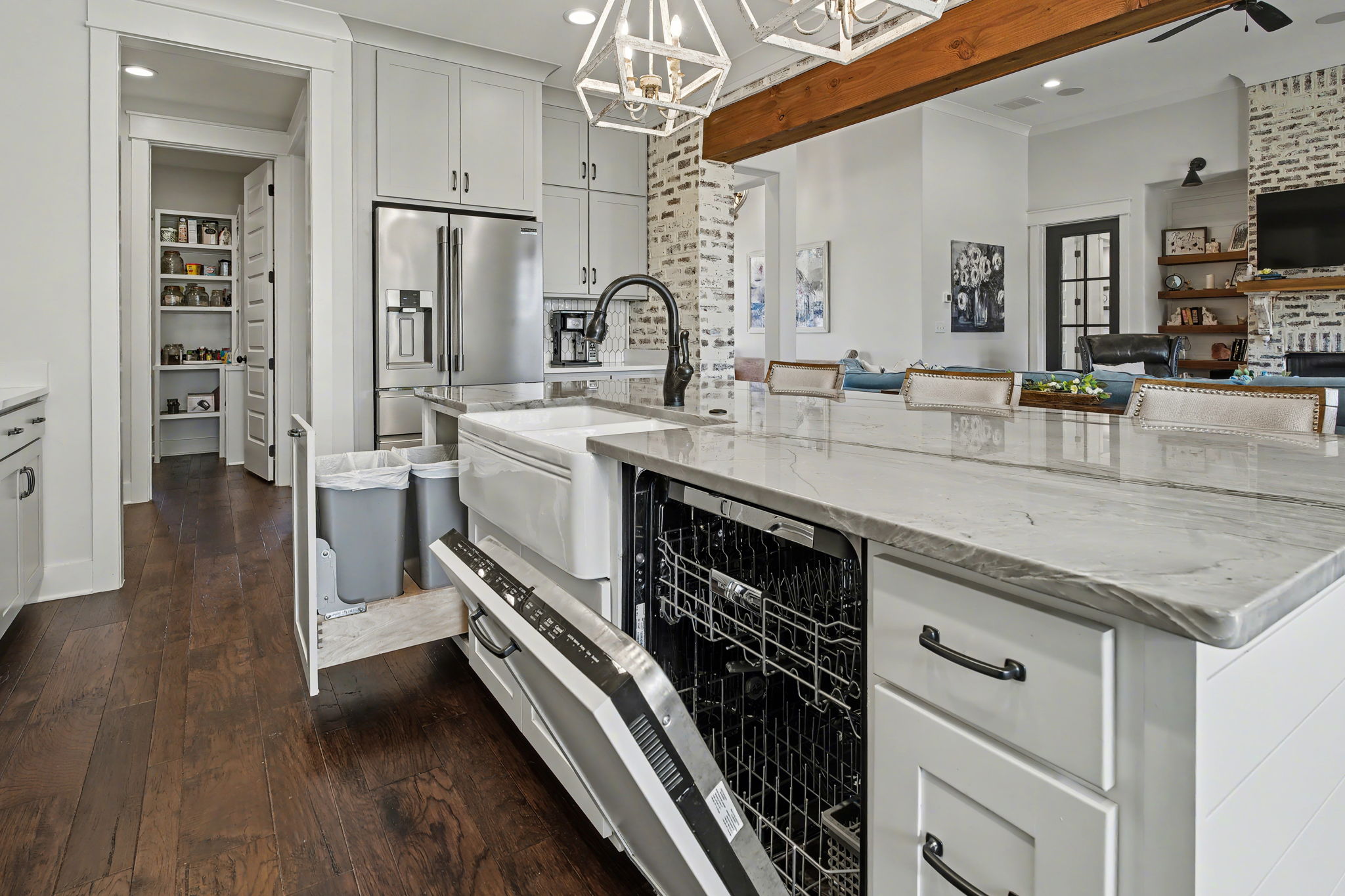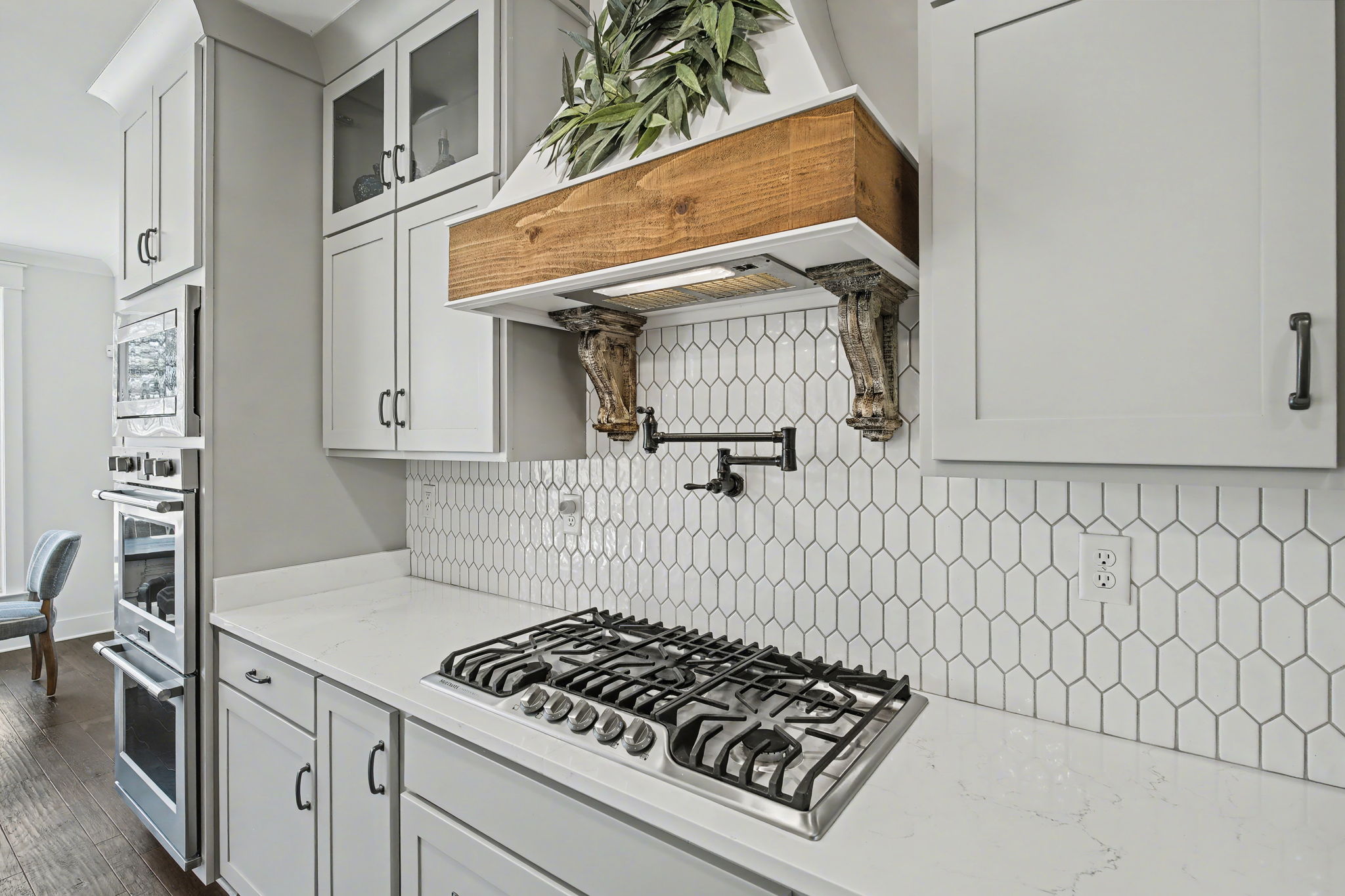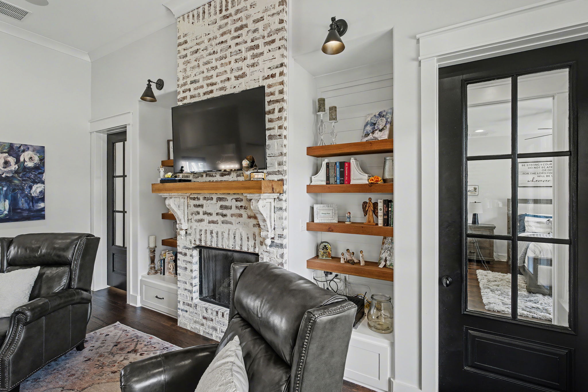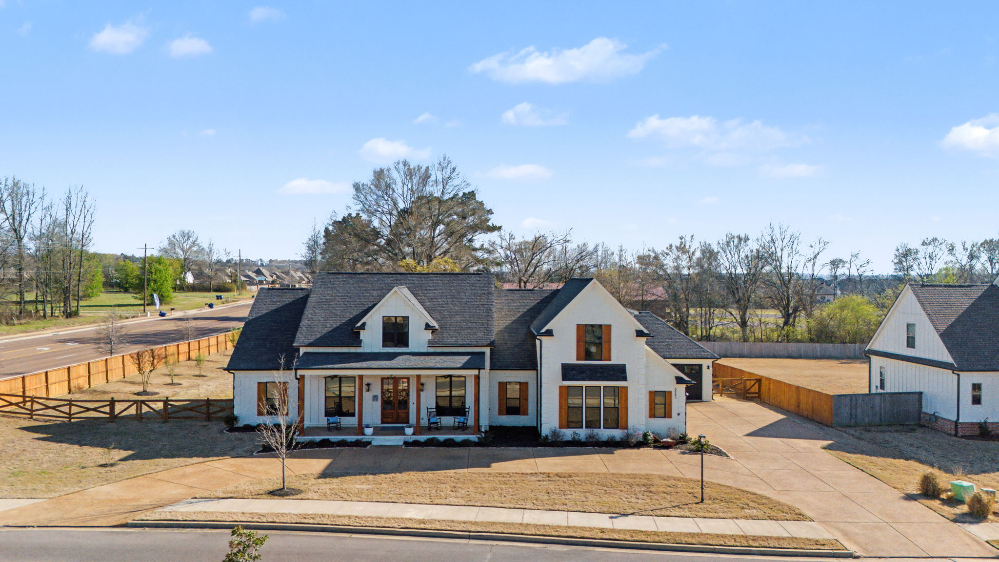 Welcome to true farmhouse style--where custom design, thoughtful details, and everyday luxury come together in a home that was built to stand apart. From the inviting front porch to the rich wood accents, this home immediately sets the tone with warmth, character, and timeless appeal. Inside, you'll find an expansive layout designed for both comfort and functionality, featuring 4 bedrooms and 3.5 baths on the main level, along with a private upstairs retreat complete with an additional bedroom, full bath, and theatre room. The heart of the home is a stunning chef's kitchen that blends beauty and practicality--highlighted by a gas cooktop with pot filler, statement vent hood, and custom cabinetry that extends all the way to the ceiling. Thoughtful touches like a built-in dishwasher panel, hidden garbage system, separate appliance pantry, and an oversized walk-in pantry create a space that is as functional as it is impressive. The primary suite offers a true retreat, featuring a spa-inspired bath with a soaking tub, oversized shower, and an incredible 10x14 walk-in closet that conveniently connects to the laundry room. Designed with flexibility in mind, the home also features a built-in office nook in the back hallway--perfect for working from home or keeping up with everyday tasks. Each downstairs bedroom includes access to private or semi-private baths, many with upgraded finishes including rain head showers.