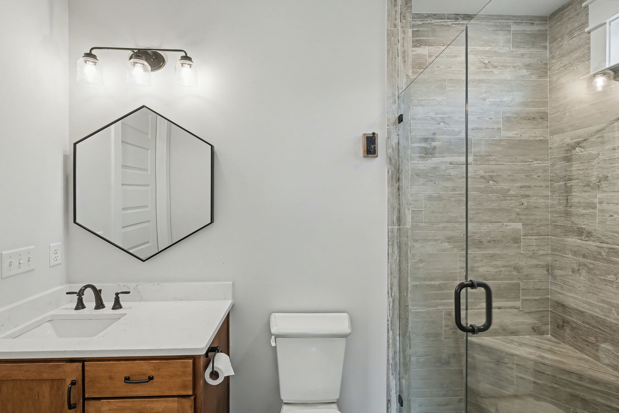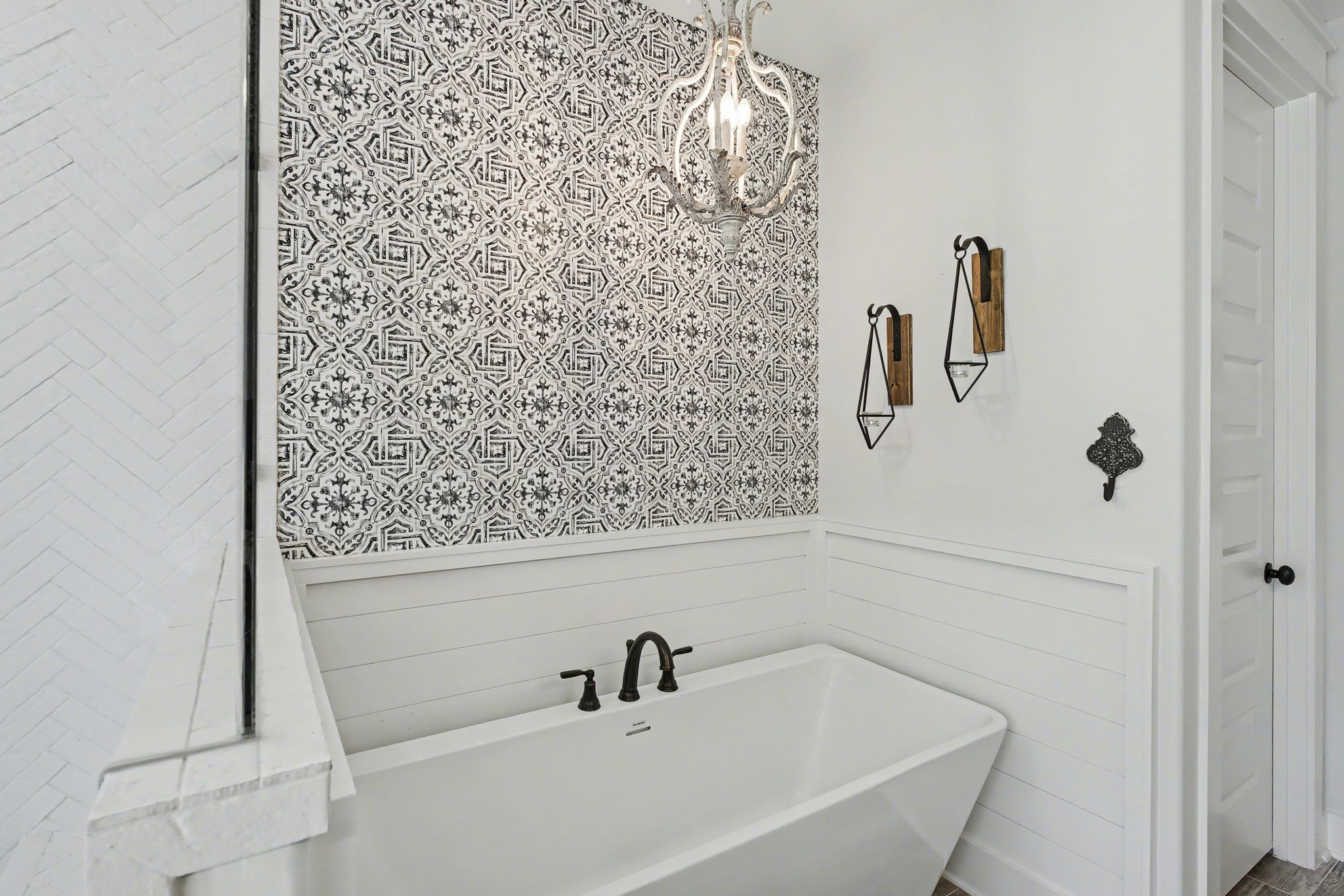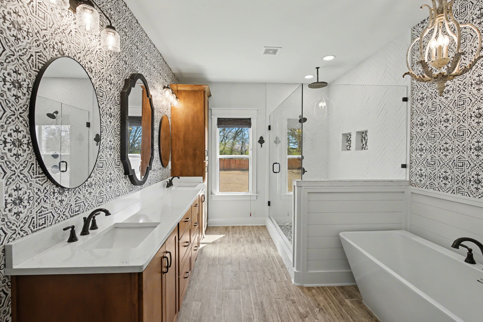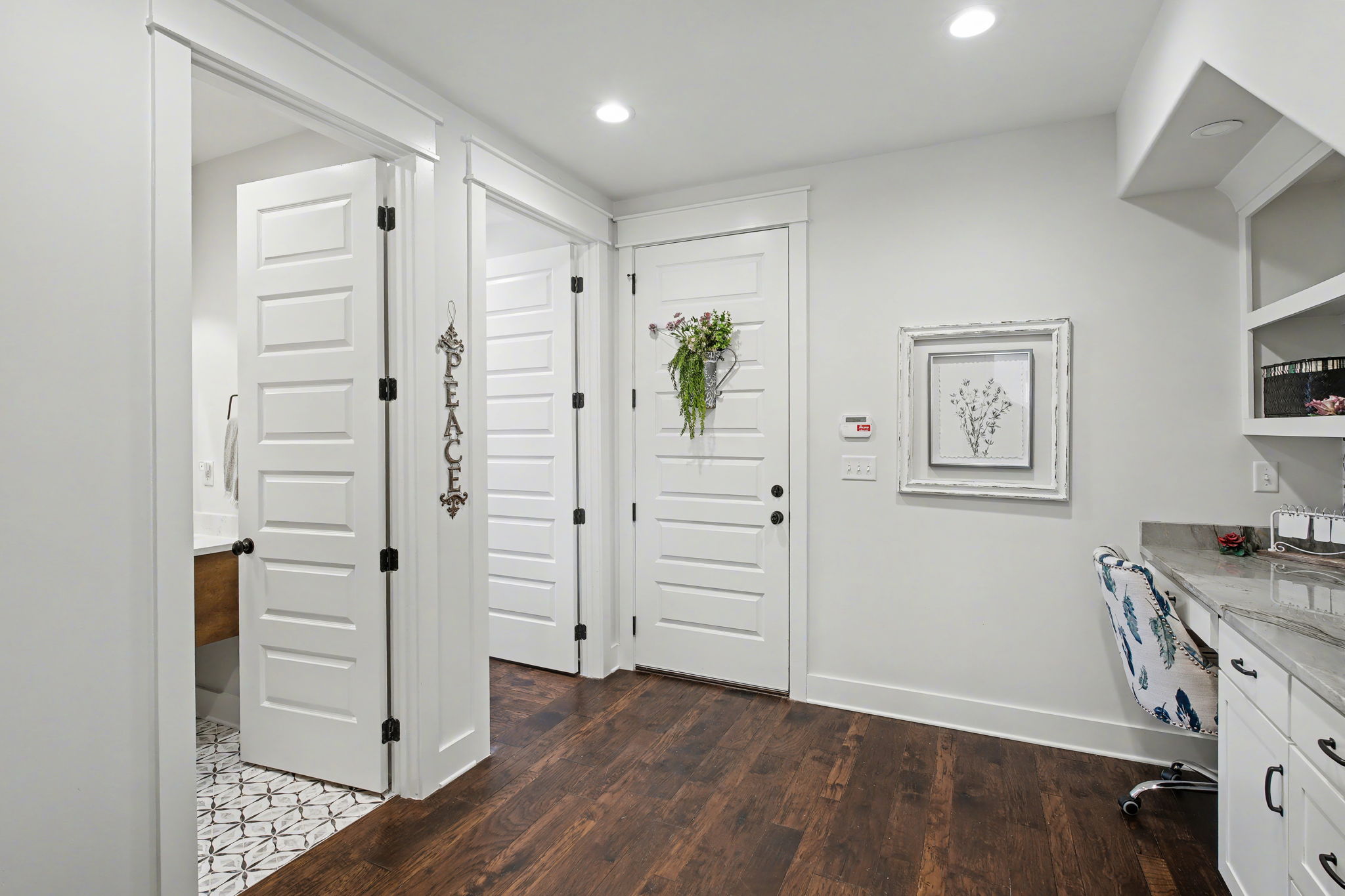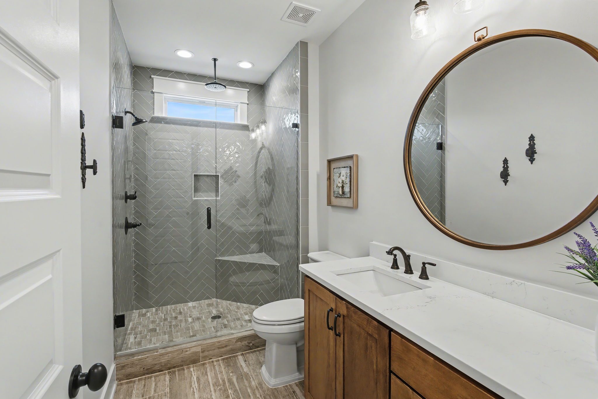 Welcome to true farmhouse style--where custom design, thoughtful details, and everyday luxury come together in a home that was built to stand apart. From the inviting front porch to the rich wood accents, this home immediately sets the tone with warmth, character, and timeless appeal. Inside, you'll find an expansive layout designed for both comfort and functionality, featuring 4 bedrooms and 3.5 baths on the main level, along with a private upstairs retreat complete with an additional bedroom, full bath, and theatre room. The heart of the home is a stunning chef's kitchen that blends beauty and practicality--highlighted by a gas cooktop with pot filler, statement vent hood, and custom cabinetry that extends all the way to the ceiling. Thoughtful touches like a built-in dishwasher panel, hidden garbage system, separate appliance pantry, and an oversized walk-in pantry create a space that is as functional as it is impressive. The primary suite offers a true retreat, featuring a spa-inspired bath with a soaking tub, oversized shower, and an incredible 10x14 walk-in closet that conveniently connects to the laundry room. Designed with flexibility in mind, the home also features a built-in office nook in the back hallway--perfect for working from home or keeping up with everyday tasks. Each downstairs bedroom includes access to private or semi-private baths, many with upgraded finishes including rain head showers.