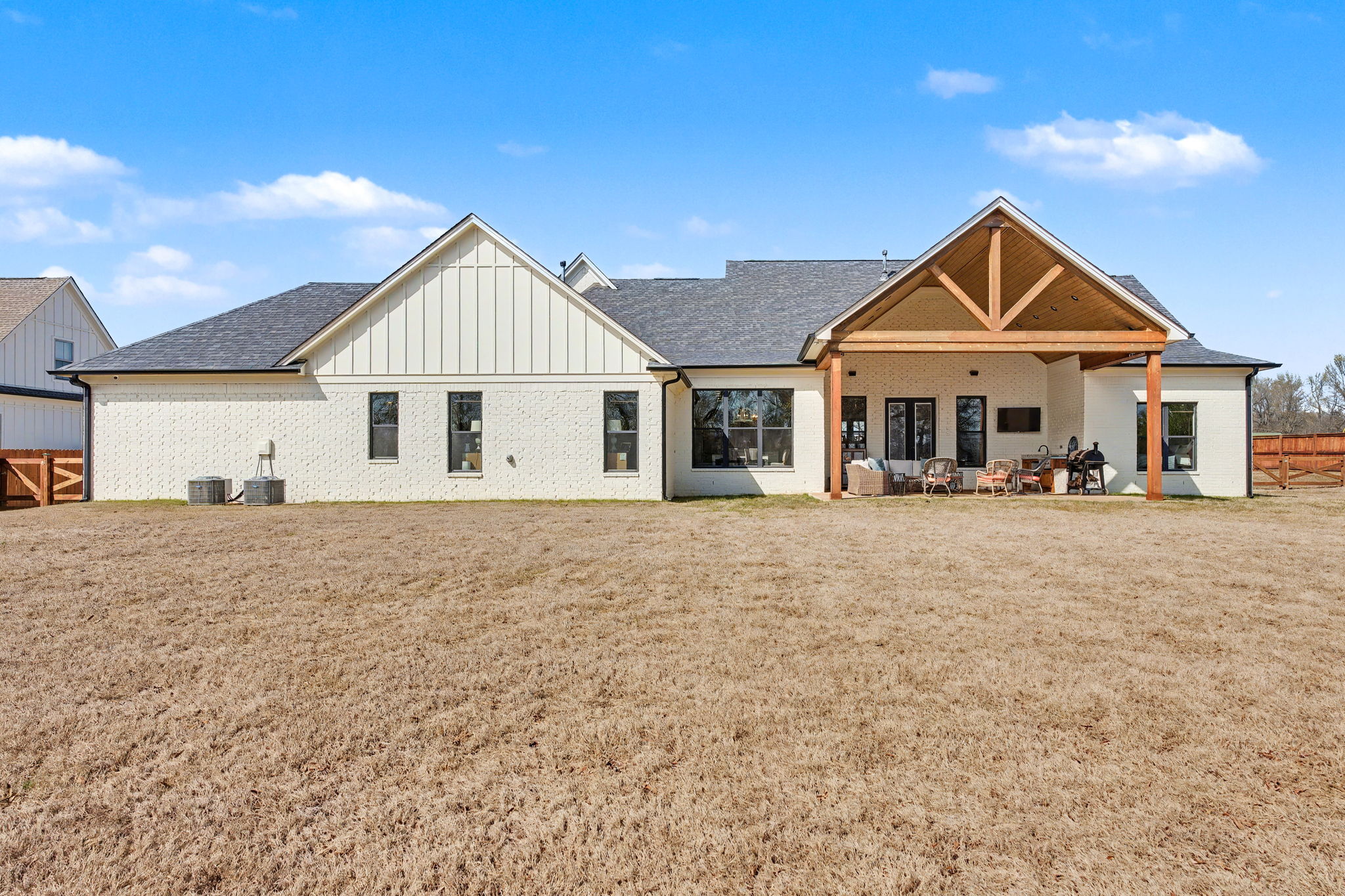Upstairs, the theatre room provides the ultimate entertainment space, while surround sound throughout the main living areas and outdoor speakers extend the experience seamlessly. Step outside to a beautifully designed farmhouse-style patio with a rich wood ceiling and a fully equipped outdoor kitchen and grilling area--perfect for entertaining or relaxing while overlooking nearly ¾ of an acre. Located in The Coves, an exclusive,